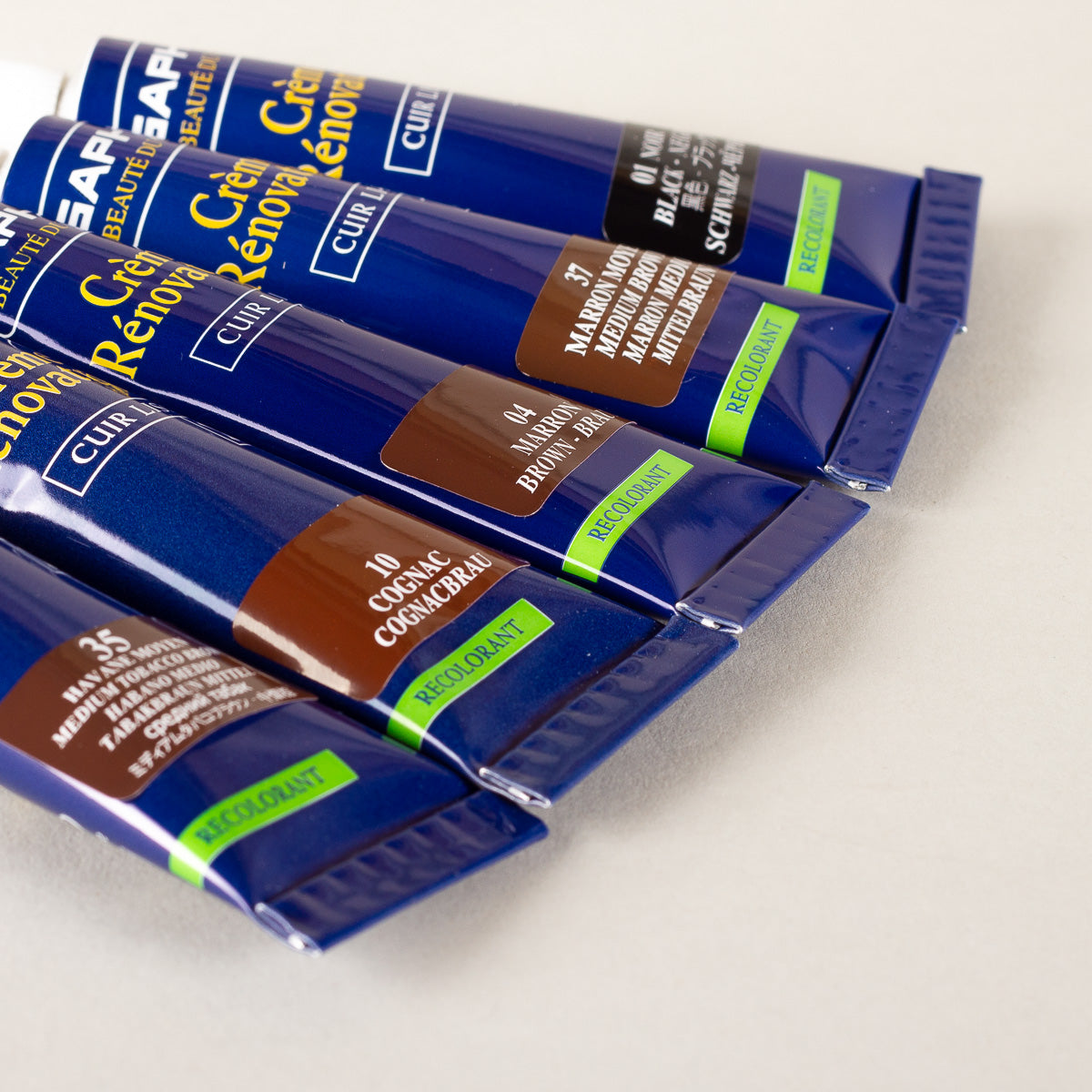 - Kleuren middels schoencrème en schoenwas: Saphir Médaille d'Or Pommadier schoencrème heeft veruit de meeste pigment. Hierdoor kleur je leer eenvoudig bij met dit Pommadier schoencrème. Pate de Luxe schoenwas geeft een gekleurd hoogglans effect en geeft meer een gekleurde nuance nadat de schoenen al volledig op kleur zijn. Lees ook onze gids over hoe je krassen en andere schade camoufleert met schoencrème en schoenwas.