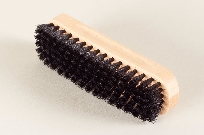 De varkenshaar borstel is in het algemeen wat harder en stugger dan de paardenhaar borstel en is geschikt voor leer met textuur, zoals pebblegrain en brogue schoenen. Door de stuggere haartjes komt de borstel dieper tussen de structuur van het leer waardoor alle opgehoopte was, crème en viezigheid goed verwijderd kan worden.