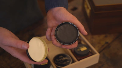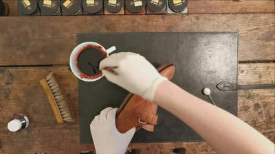 Normaal gesproken begin je een poetsbeurt met Saphir Médaille d'Or Renovateur, maar omdat je schoenen net geverfd zijn, sla je die stap dit keer over. In plaats daarvan start je met Saphir Médaille d'Or Pommadier schoencrème. Die is milder en verwijdert daardoor minder van de vers aangebrachte verf. Bovendien helpt de bijenwas in de crème om de nieuwe kleur te fixeren en te verzegelen.