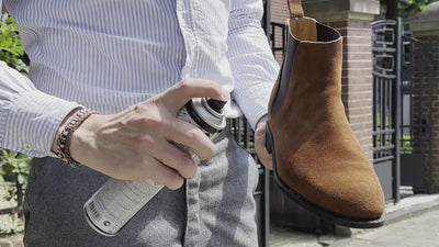 Daarna bescherm je het leer met Saphir Médaille d’Or Super Invulner Spray. Deze onzichtbare beschermlaag maakt je schoenen water- en vuilafstotend zonder de natuurlijke structuur of uitstraling van het leer aan te tasten. Houd de spray ongeveer 15 cm van de schoen en verdeel gelijkmatig over het hele oppervlak, ook langs de naden waar zool en leer samenkomen. Laat de spray goed intrekken en borstel het suède daarna op met een crêpeborstel. Zijn de schoenen nog nooit eerder behandeld, herhaal het proces na 30 minuten voor het beste resultaat.